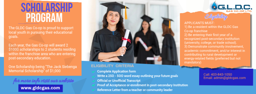 Welcome to G.L.D.C GAS CO-OP LTD. GLDC GAS NEW MEMBER INFORMATION BOOKLET VIEW ONLINE BILL / PAYMENTS AGM Supporting Education. Strengthening Communities.GLDC Gas Co-op is proud to help local students pursue their post-secondary goals through our annual scholarship program. CLICK HERE TO APPLY FOR THE GLDC SCHOLARSHIP PROGRAM QUICK LINKS USEFULLINKS i NEWSLETTER COMMUNITYINVOLVEMENT FEDERATIONACHIEVEMENTAWARDS